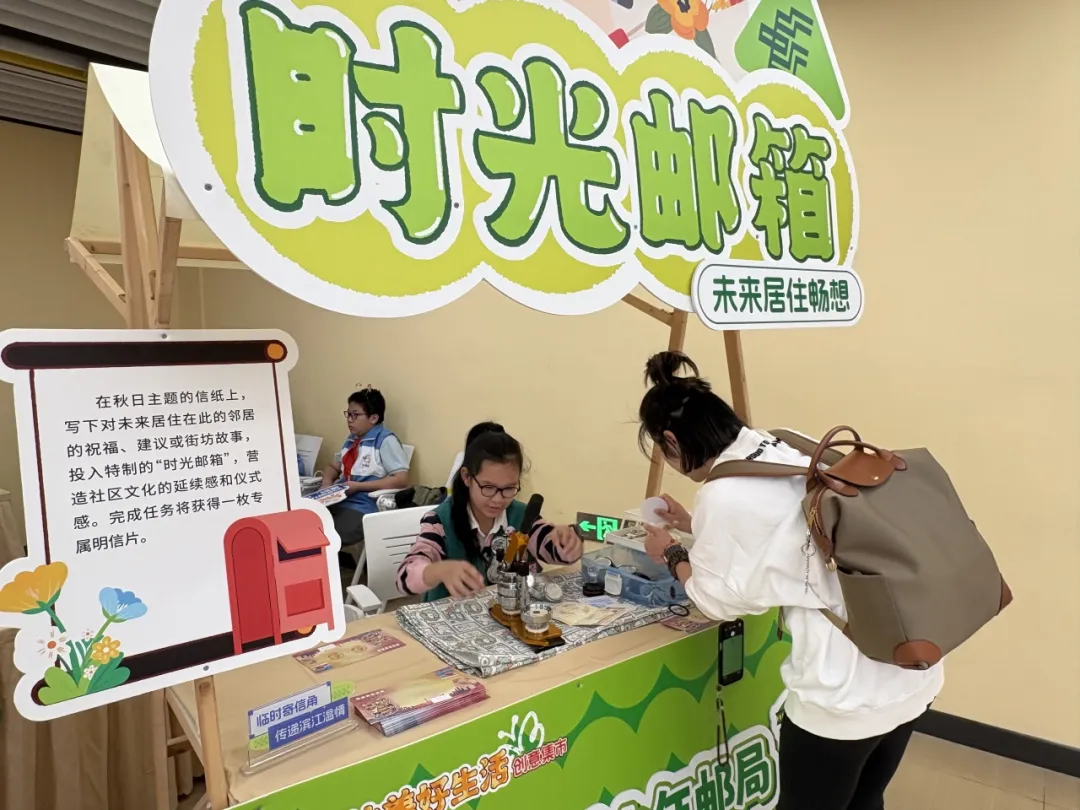 “未来居住畅想”板块里,上海凤城少年邮局设置“时光邮箱”,孩子们在秋日信纸上写下对街坊未来的祝福与建议,投入邮箱后将形成社区共建档案;“杨杨直播间”内,红领巾小记者与少年宫未来媒体人社团开展街采快闪活动,用童言童语收集大众关于“未来社区”的创意构想。
