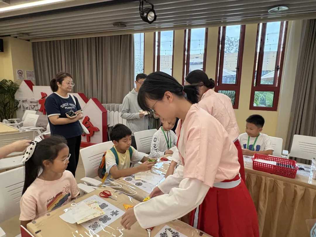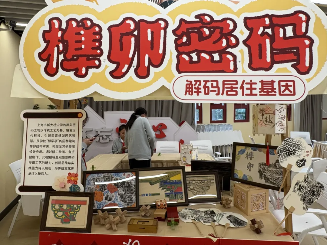 活动通过四大板块联动,串联起从传统匠造到未来畅想的完整体验:在“解码居住基因”板块,上海市新大桥中学“承运榫卯工坊”带来“榫卯密码”体验活动,引导学生动手拼搭鲁班锁、绘制结构图,直观感受中国传统建筑的力学智慧;杨浦区少年宫海派剪纸社团则带领参与者剪制“福禄寿禧”团花,并辅以秋色晕染工艺,创作独具上海风情的“弄里窗花”。